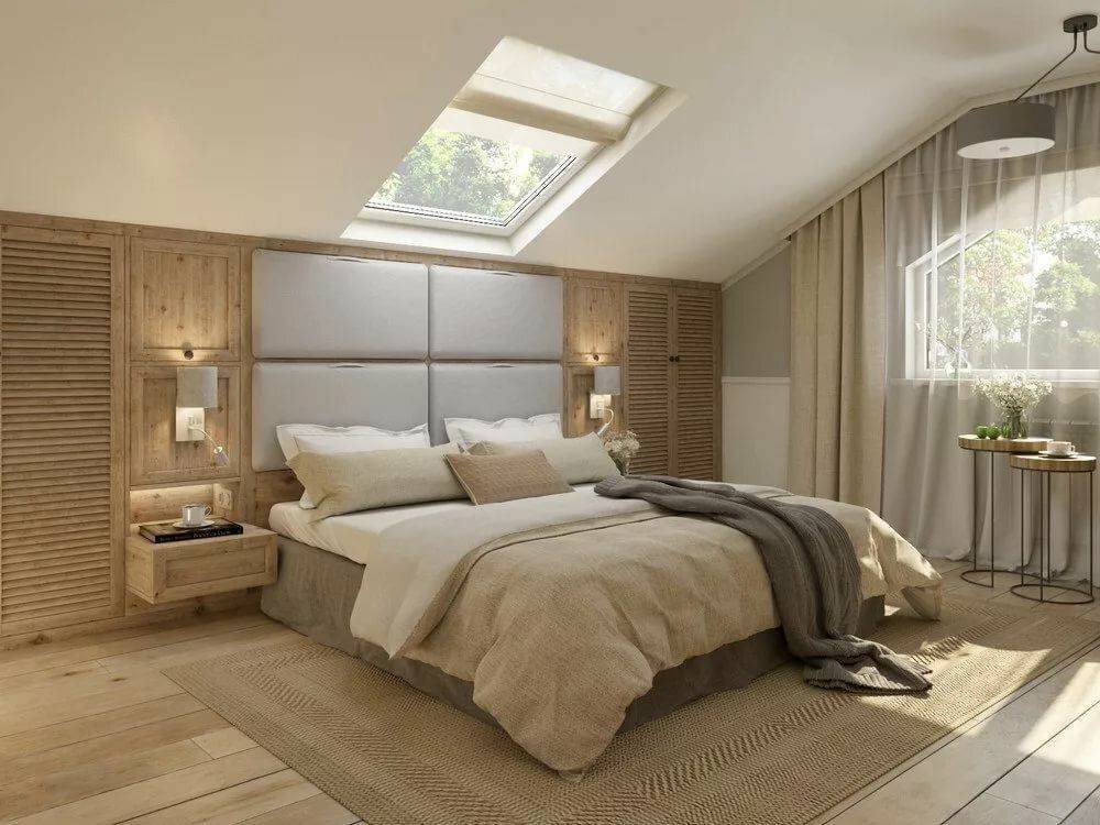 На фото спальня в деревянном доме, оформленная в скандинавском стиле