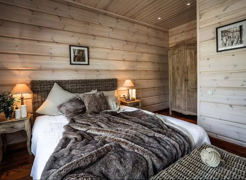 Меховой плед – яркий акцент в интерьере деревянной спальниИсточник oboiman.ru