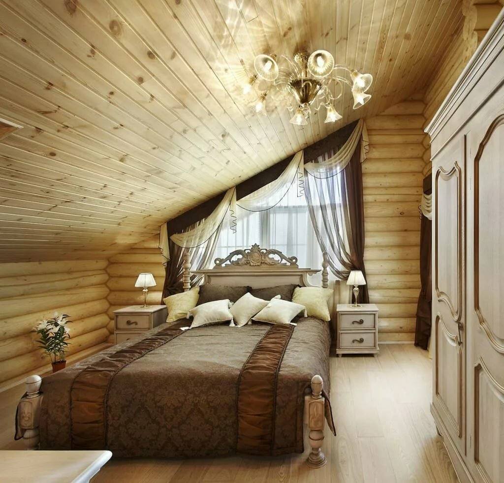 В итоге при желании и должной настойчивости интерьер спальни в деревянном доме можно обставить великолепными шкафами и тумбами, выложив за них не больше одной зарплаты.