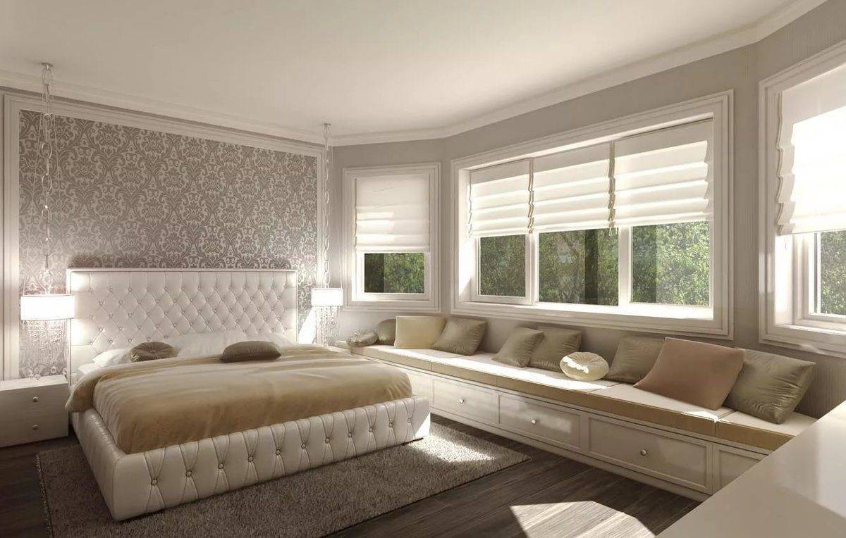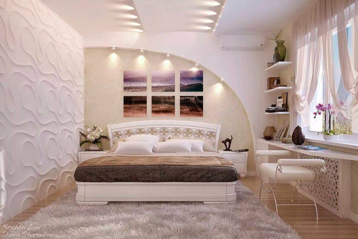 Идеи для современной спальни разные, но правило одно — приглушенные цвета и минимализм. Белый цвет прекрасно подходит для спальни любого размера, поэтому композиции в этом окрасе подойдут многим. Белый является нейтральным, поэтому он будет хорошо гармонировать с остальными оттенками, независимо от их насыщенности. Светлая спальня выглядит лучше всего в версии «тотальный вид», то есть фокусируется на цветах только в диапазоне белого, возможно, в разных тонах. Вы можете выбрать в таком цвете стены, текстиль, мебель для спальни и аксессуары