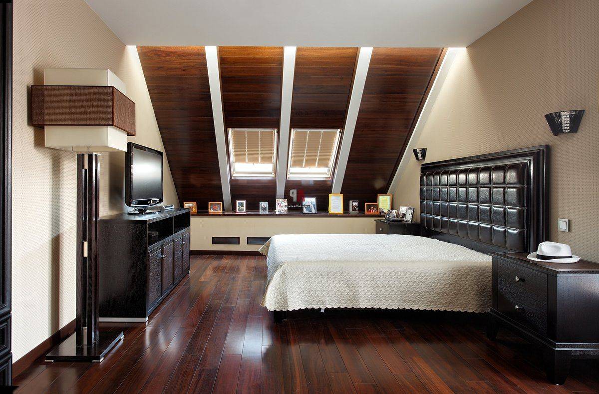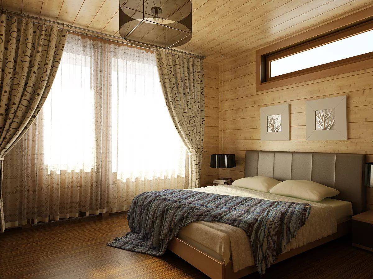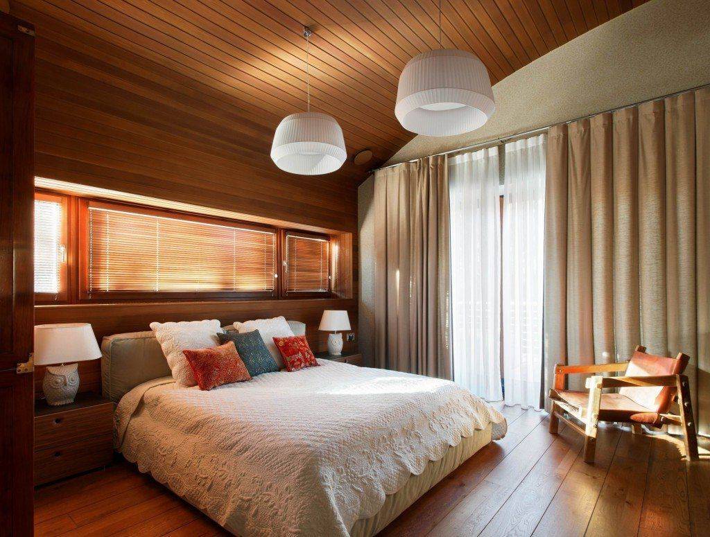 Большая спальня в доме из бруса, каркасном или панельном – это настоящая находка для творчества дизайнеров. Чем больше площадь, тем больше возможностей для полета фантазии, воплощения самых смелых идей. Детские могут быть устроены с максимальным комфортом – двухъярусные кровати, кровати-корабли, кровати-домики на дереве. Спальни для взрослых могут быть украшены красивым многоуровневым потолком, балками или иными оригинальными конструкциями.