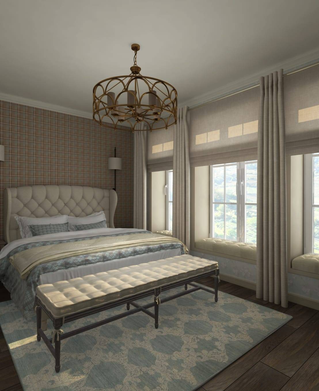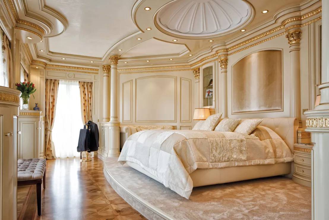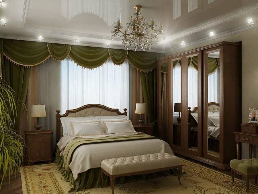В условиях большой спальной комнаты можно разместить не только кровать и прикроватные тумбочки, но и гардеробную, туалетный столик с высоким зеркалом, кресла, банкетки и рабочий стол.