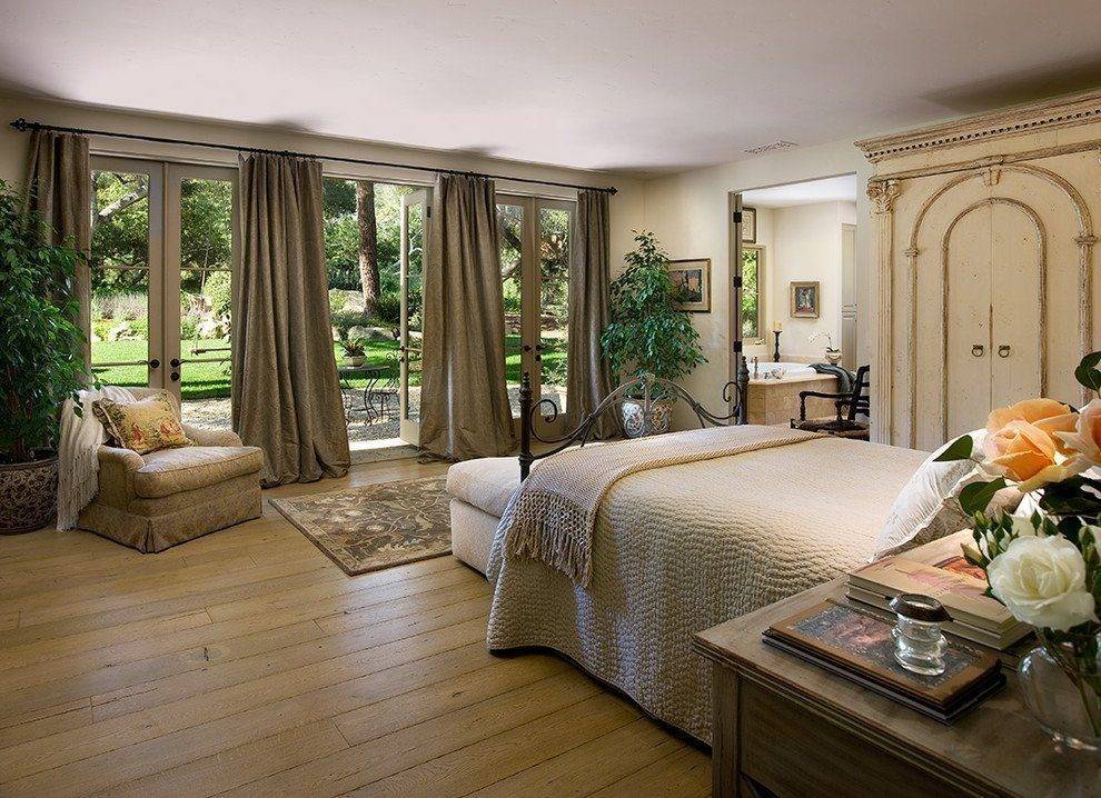 В дизайн спальни с деревянной кроватью в стиле кантри удачно впишутся: