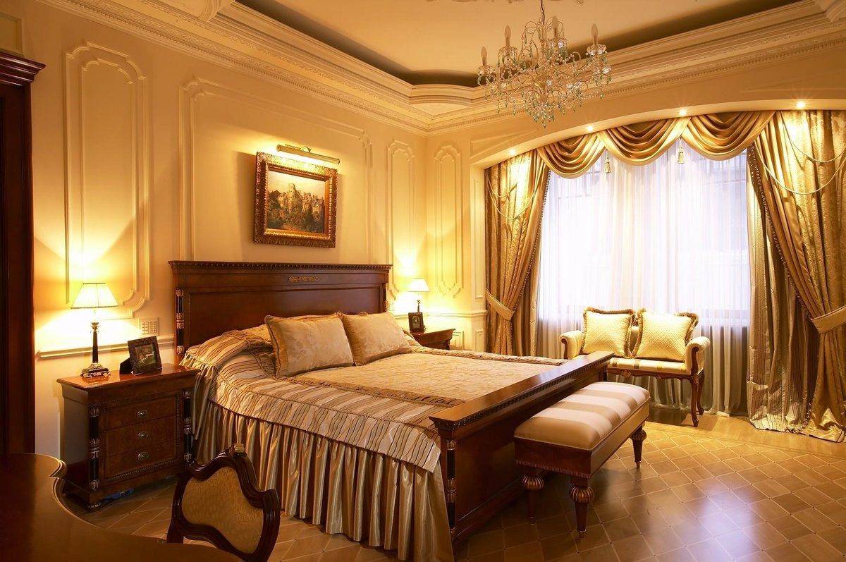 Выбор осветительных приборов во многом зависит от стилистики интерьера. Например, в классической обстановке встроенные светильники будут смотреться не очень органично. Вместо них можно приобрести элегантные торшеры или изящные бра. Не забывайте и о естественном освещении. Если комната выполнена в темных тонах, то окна не стоит закрывать тяжелыми и плотными шторами, иначе атмосфера в спальне будет слишком мрачной.