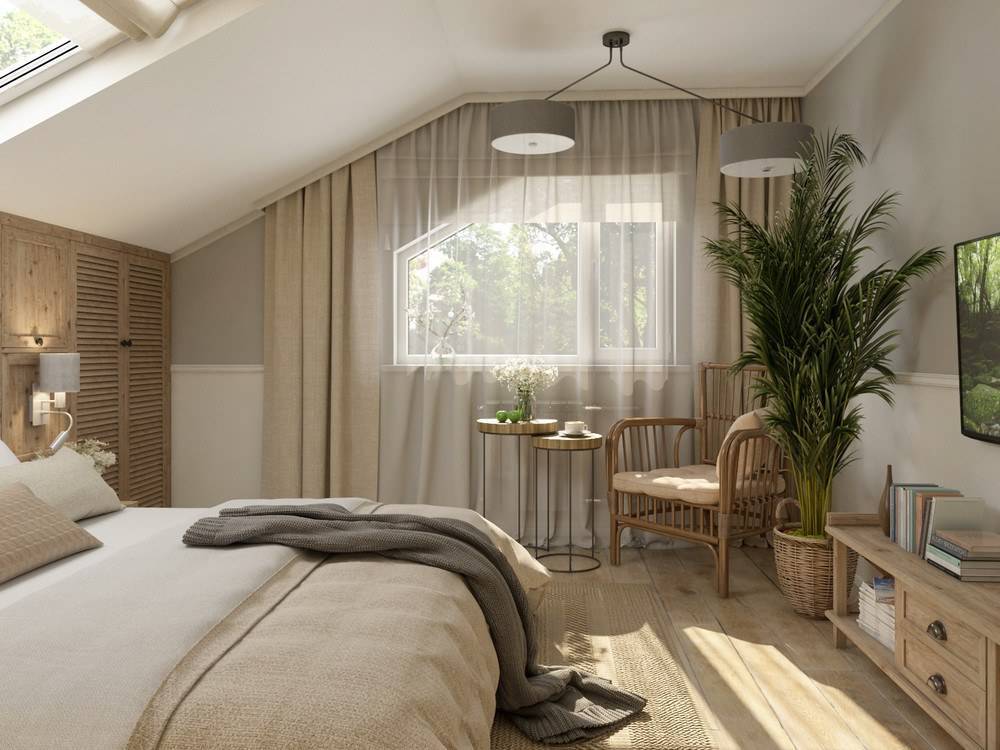 Хорошее решение — разместить спальню в четко отделенной ночной зоне (например, закрытой дополнительной дверью). Таким образом, вы обеспечите тишину и покой, необходимые для отдыха, а если гости приедут, — и уединение. Рассмотрите варианты множества спален для частного дома, дизайн которых обязательно пригодится.