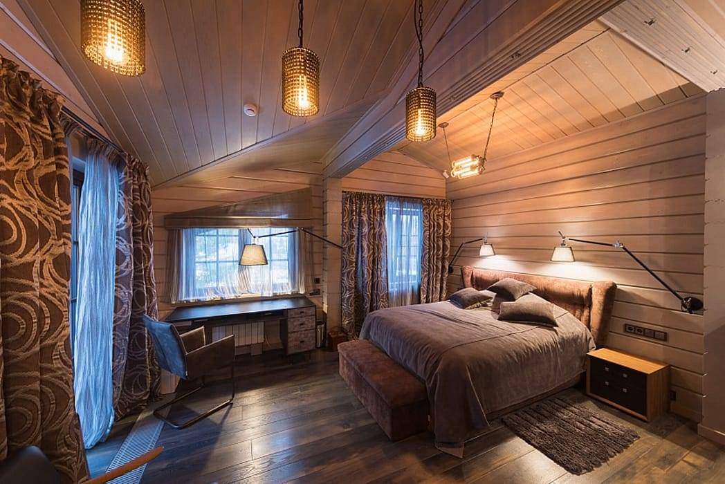 Кровать для спальни в деревянном доме запросто может быть облагорожена балдахином. У стены можно обустроить вместительный гардероб, туалетный столик, мини-библиотеку и место для чтения книг. Большое пространство требует грамотной организации искусственного освещения. Здесь правило простое – каждая зона должна быть подсвечена отдельно. Светильники нужны поверх платяного шкафа, гардероба, по обеим сторонам двуспальной кровати. У рабочего стола, если есть такая зона в комнате.
