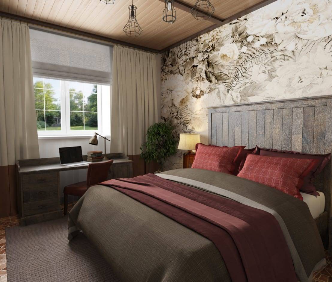 Создать уютную обстановку, напоминающую интерьеры английской деревни, можно и в условиях спальни в доме из бруса. Стены в проектах кантри отштукатуренные, потолок отделан вагонкой и балками из темных пород на светлом фоне. Пол чаще всего выполняется из дерева насыщенного цвета.
