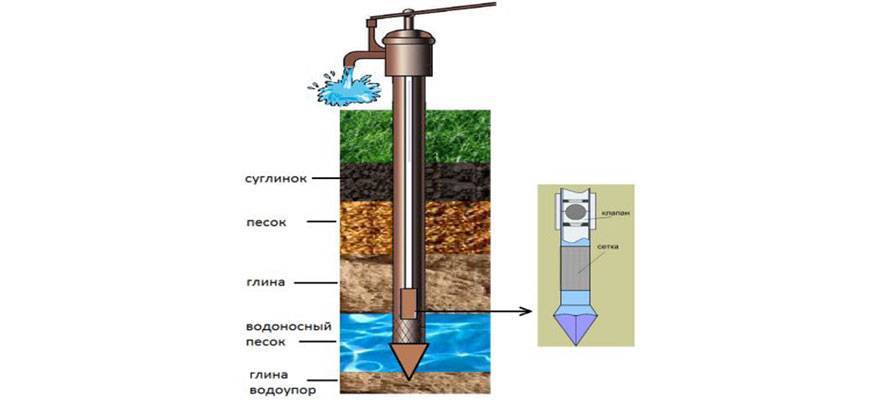 В самом низу колодца находится наконечник в форме конуса или пирамиды. Фильтр представляет собой небольшой отрезок трубы, диаметр которой меньше толщины иглы.