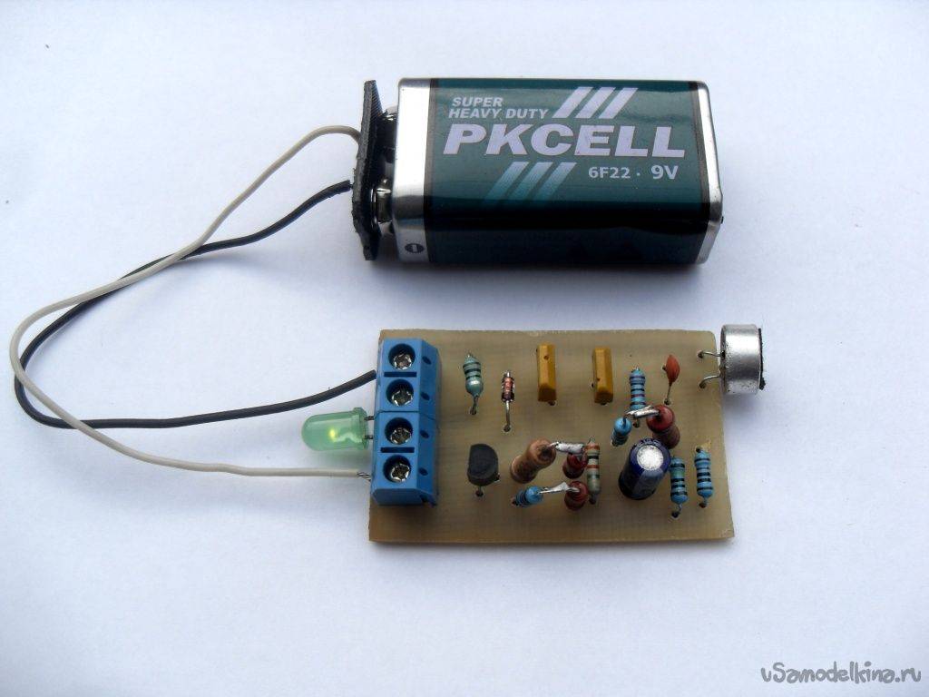 Как можно судить по фото, самодельные акустические выключатели довольно компактны, к ним легко подобрать футляр и использовать в мобильных и статичных приборах, для питания используются обычные батарейки. Можно задействовать также и зарядные устройства от мобильных телефонов с выходным напряжением в 5 вольт.