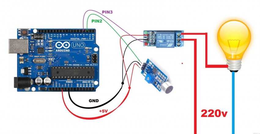 Инструкцию для изготовления выключателя своими руками можно рассмотреть на примере использования микроконтроллера Ардуино, с присоединением к нему двух плат: звукового модуля, т.е. микрофона с усилителями и силового реле. Будет необходим источник питания в 5 вольт, и USB кабель для подключения к ПК.