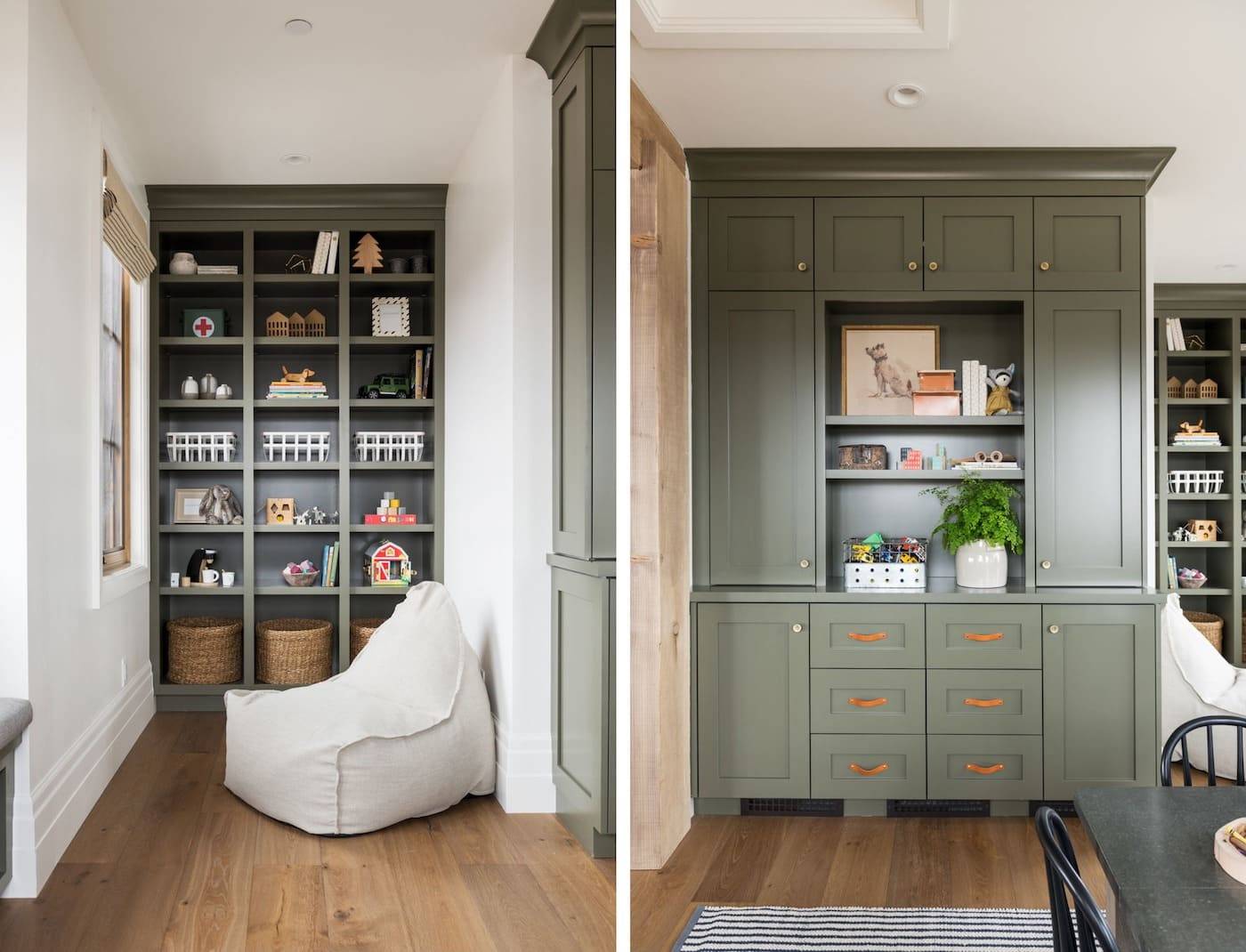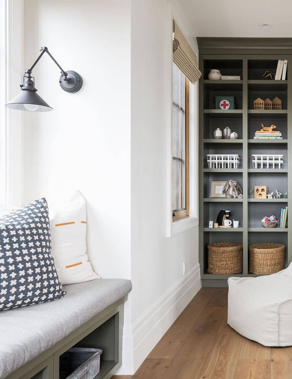 В американском интерьере вдоль стен располагают полки, негабаритные комоды. Если в помещении есть ниши, то свободное пространство приспосабливают под встроенные шкафы. Системы хранения психологически не давят на человека, не создают визуального уменьшения квадратных метров.