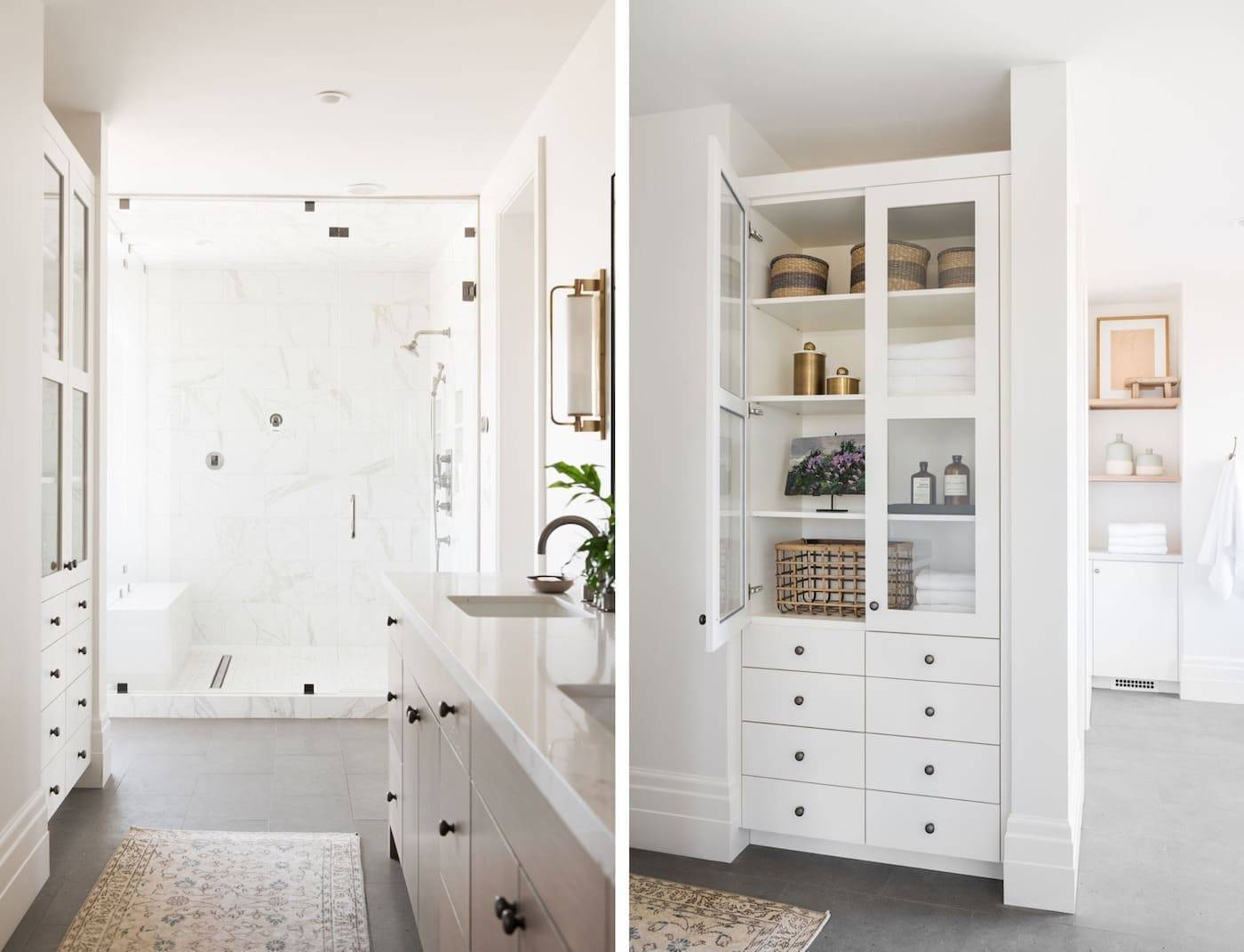 Здесь также могут присутствовать цветы и обязательный атрибут – это сложенные махровые банные полотенца, которые очень уютно располагаются на полочках шкафа.