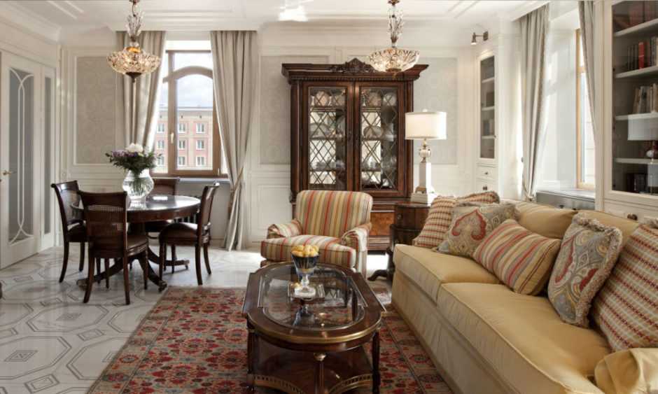 Так как гостиная предназначена для общения с семьей и друзьями, в интерьере этой комнаты должны быть большой диван, кресла, журнальный стол. Также может стоять комод или небольшой шкафчик.