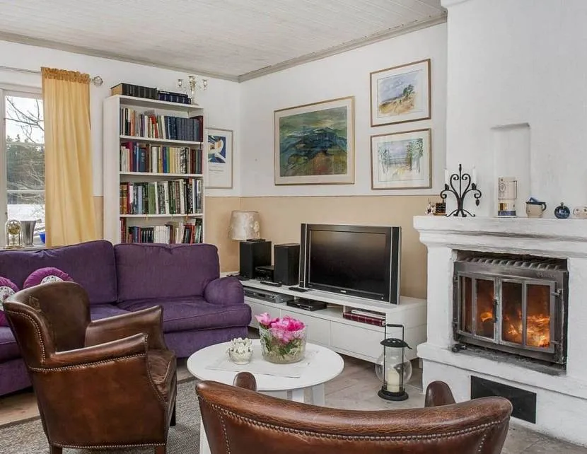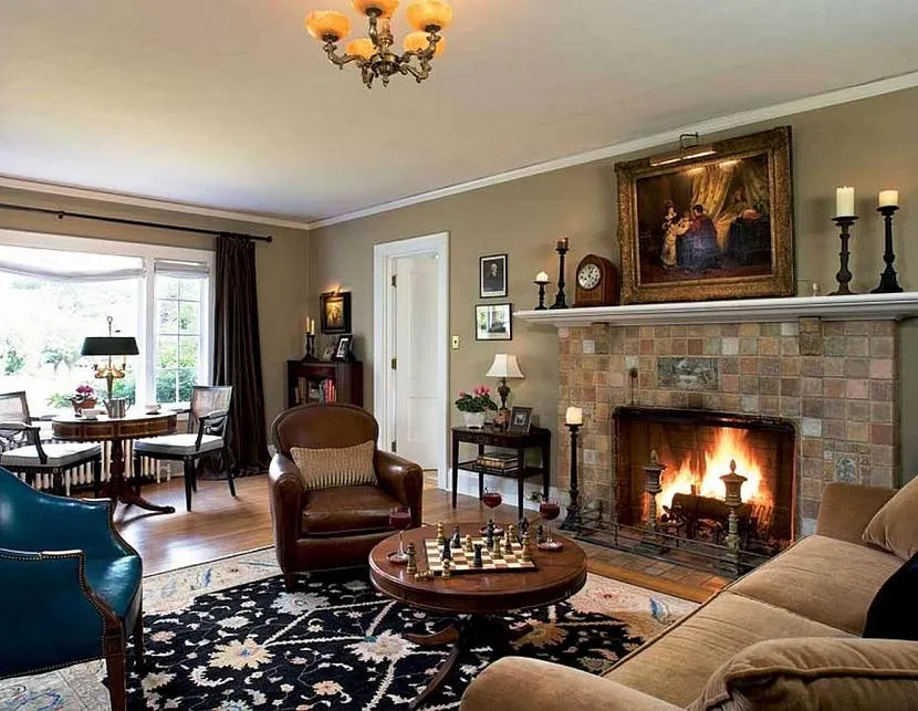 Мебель обычно делают из дерева, можно выбирать и плетеные элементы, например, кресло-качалку или тот же журнальный стол. Нередко можно встретить у стены камин, тогда диван обязательно будет повернут к нему.