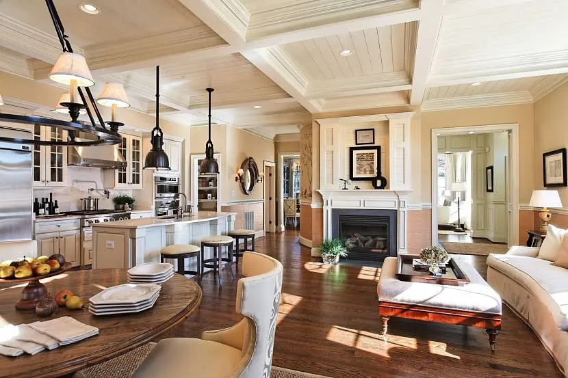 Минимализм и простота – это важные черты дома в американском стиле. Часто в таких домах бывает специальная зона для отдыха по правилам — с камином, удобными креслами или диваном и элементами дизайна для уюта по вкусу хозяина. Полы часто застилаются ламинатом или древесиной. Потолок окрашивают в светлые цвета, белый, или близкие к нему. Часто его отделывают специальными балками, для красоты.