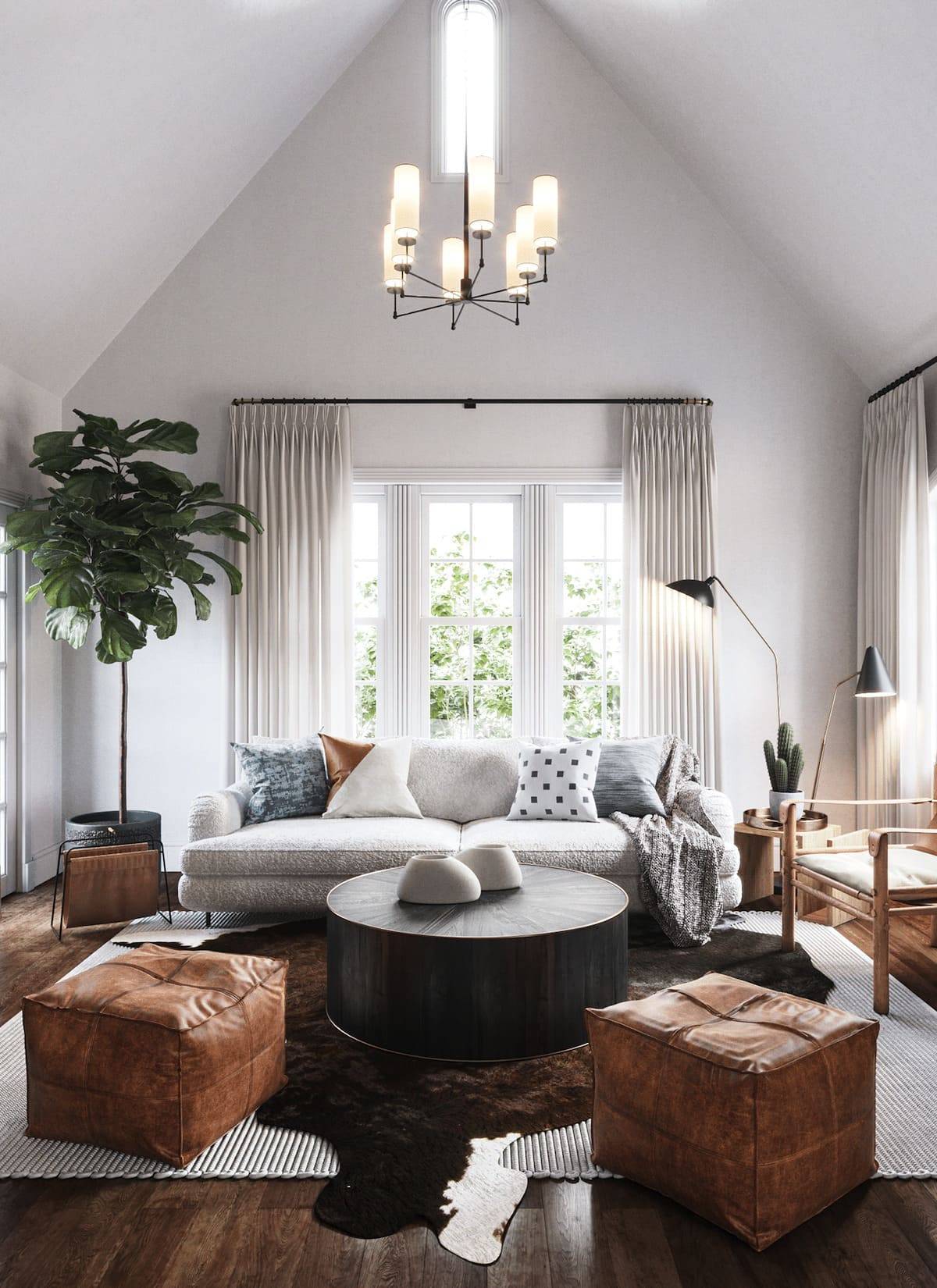 Гостиная в западном варианте интерьера — это место для встреч с гостями и дружеских посиделок, поэтому она должна быть максимально комфортной и уютной. Она должна быть просторной, светлой, обязательно с мягким диваном и кофейным столиком, Телевизор — желательный, хоть и не обязательный в современном доме элемент