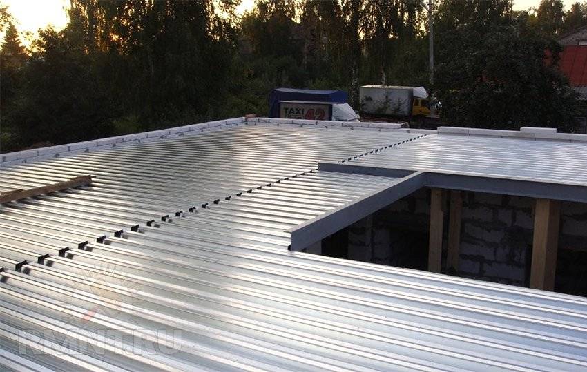 Иногда разумно делать опалубку несъемной, используя для этого профилированные листы , ориентируя их узкой полкой вниз. Их располагают вдоль плиты, чтобы волны при заливке образовывали многочисленные ребра жесткости. Расчет толщины ведется от нижнего ребра, таким образом экономия бетонной смеси составляет 20-25%. При этом высота гребня не должна превышать трети общей толщины плиты. Если опалубку снимать не планируется, в нее вкручивают саморезы с резиновой шайбой и привязывают их тонкой проволокой к арматуре.