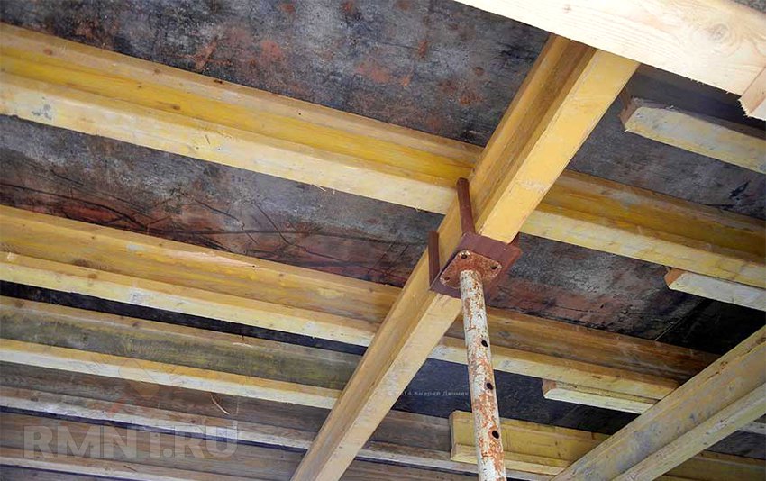 - На поверхности несущих стен и перегородок собираются вертикальные боковые детали каркаса опалубки, поверх горизонтальной обрешетки из брусьев настилаются листы фанеры.