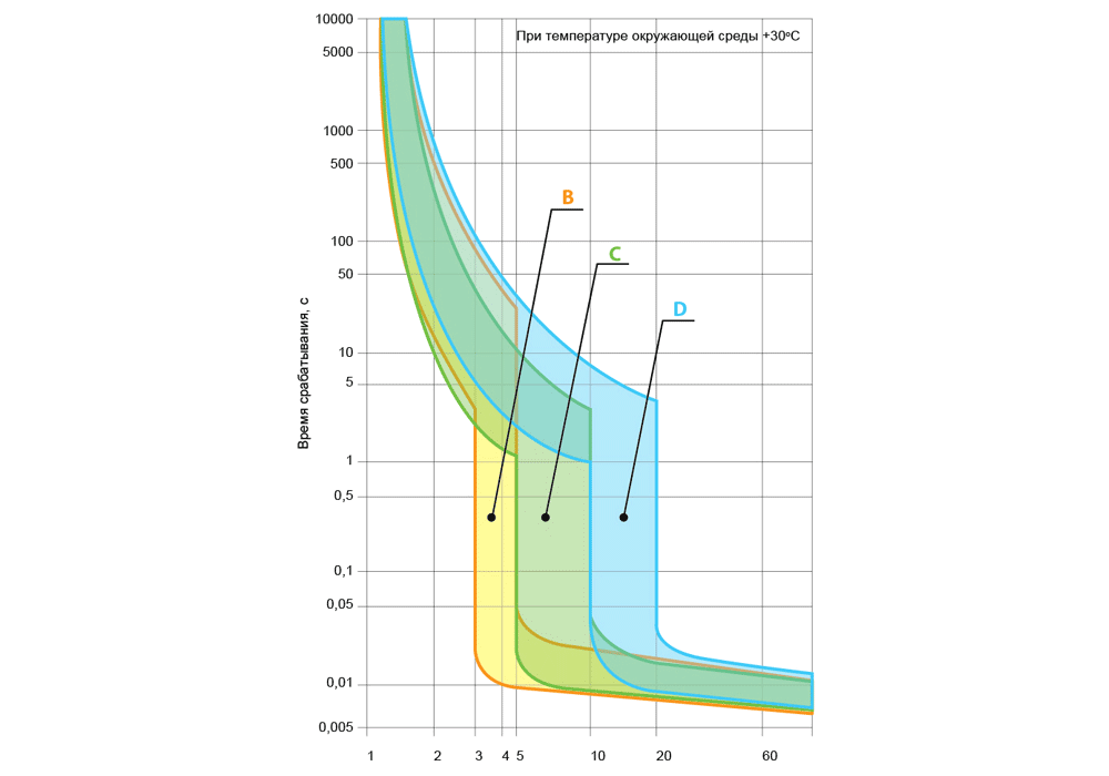 Каждый автомат рассчитан на определенное превышение силы тока (ток перегрузки), при котором он срабатывает, а буквами (A, B, C, D) обозначают величину этого превышения. Токи перегрузки, как правило, не затянуты по времени и не вызывают повреждения линии.