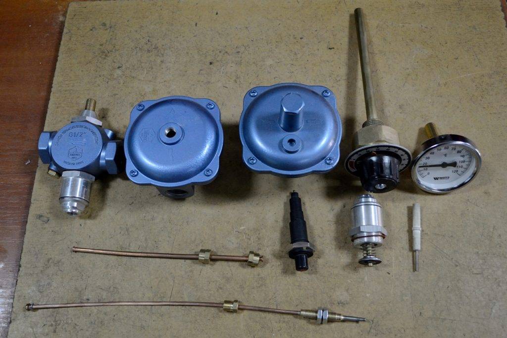Температурный регулятор нагнетает подачу газа к горелке, когда вода остывает в контуре системы отопления, и перекрывает поток при достаточном нагреве. Монтируется термодатчик в газопровод. Оснащен он такими узлами: