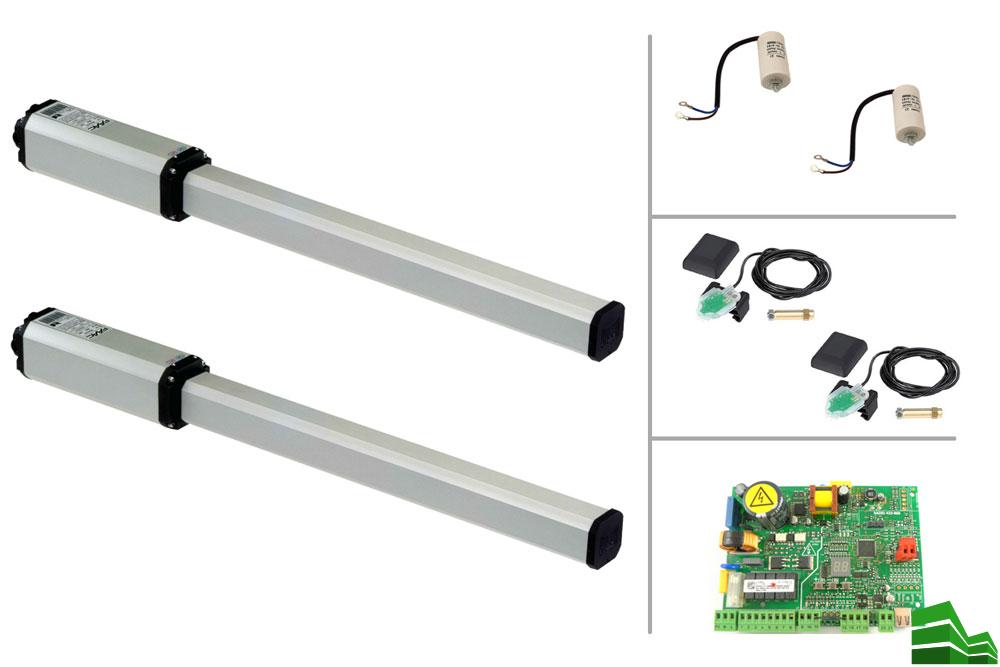 В продаже много готовых комплектов. В их составе, как правило, эл/привод, элементы схемы (датчики, концевые выключатели и тому подобное), пульт. Модификаций много. Цена самых дешевых – около 15 980 рублей. Например, «WINGO» серии 2024KCE, которая способна управлять открыванием створок весом до 400 кг при помощи двигателя на 24 В. При установке покупного оборудования следует руководствоваться рекомендациями производителя.