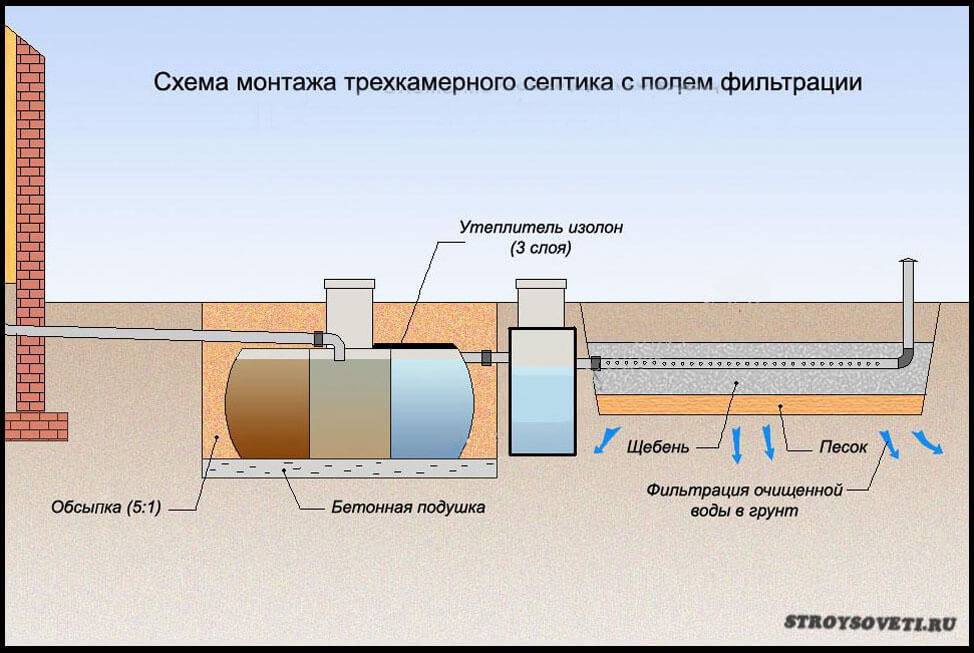 Котлован для очистного сооружения нужно копать с учетом уровня грунтовых вод. Нельзя располагать его в том места Вашего участка, где грунтовые воды подходят близко к поверхности. По правилам, дно очистной станции должно быть не менее, чем на 1,5 м выше грунтовых вод.