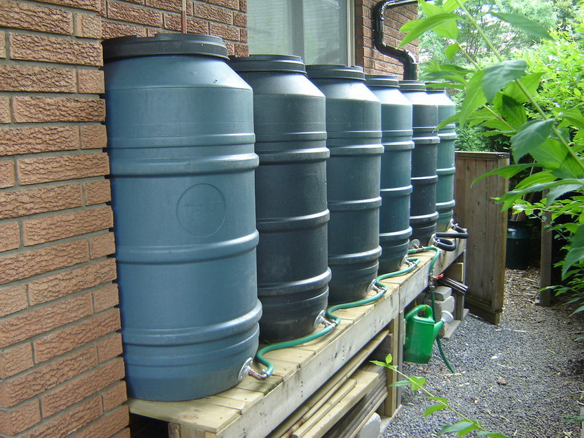 Необходимо установить большую емкость для воды. Для этого берется обыкновенная бочка и устанавливается на высоту 1,5-2 м над уровнем земли. Бочку подключают к общей системе водоснабжения, или подводят шланг, через который ее периодически будут заполнять водой. За день вода под лучами солнца нагревается, а вечером можно производить полив растений подогретой водой, что благоприятно влияет на их рост. Бочку необходимо накрыть, чтобы под лучами солнца вода в ней не зацветала.