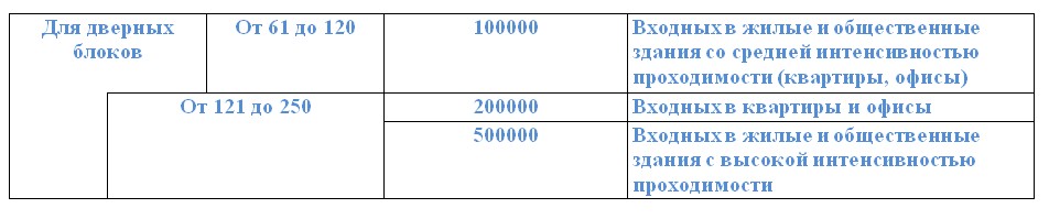При испытании на безотказность петли должны выдерживать число циклов «открывание – закрывание» в соответствии с таблицей