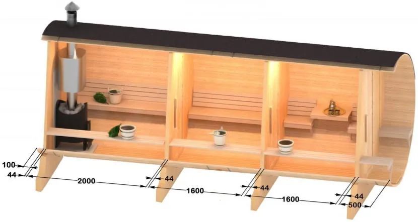 Самые большие бочки достигают 6 метров с небольшим. Здесь уже может быть до 3 комнат: раздевалка (с продуманным местом отдыха, столиком, вешалками для одежды, скамьями), помывочная (с душем или емкостями с водой), парная (с удобными скамьями лежаками); либо в случае сауны моечная может стать комнатой отдыха. В среднем, длина каждого помещения будет составлять 1-2 метра.