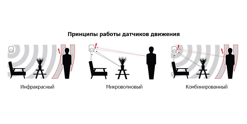 Для правильной установки прибора необходимо учитывать принцип его работы: ИК-датчик хорошо реагирует на «прошлые» движения, но может не срабатывать при движении к нему, а ультразвуковой и микроволновый датчики воспринимают движение «навстречу» сами себя».