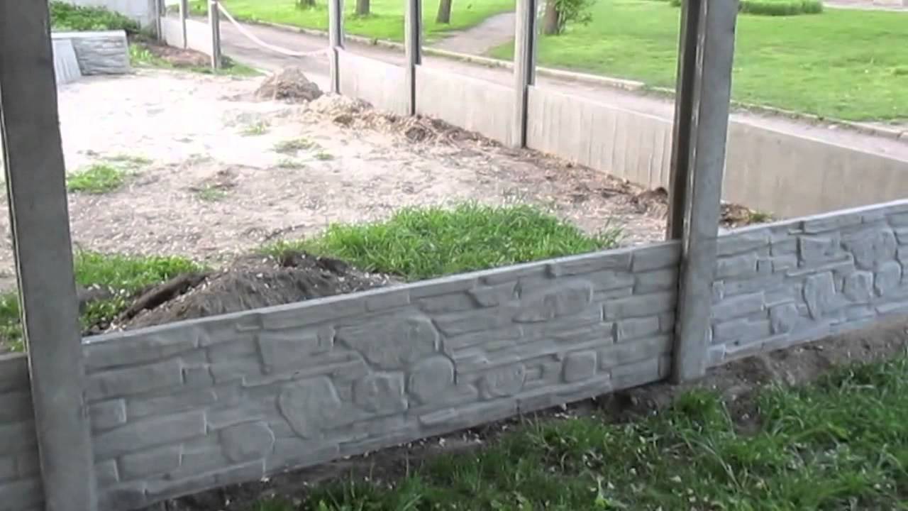 Панели такого забора изготавливаются литьевым способом. Раствор помещают в полиуретановые формы, которые имитируют плитку, кирпич, натуральный камень. Высота готовой плиты составляет 2,5 м, толщина — 12 см, длина — 5 м. Материал устойчив к влиянию атмосферных факторов, прочен, характеризуется длительным сроком эксплуатации.