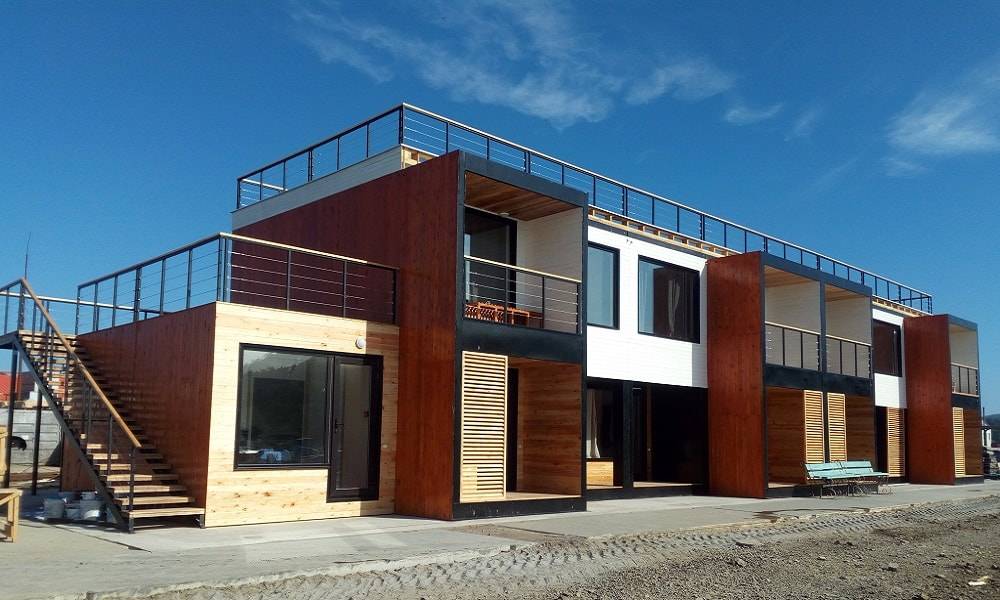 - Жилые строения. Благодаря модульным конструкциям можно возвести строения с большим количеством комнат и помещений, которые могут использоваться для любых целей. В них можно провести вентиляцию, сантехнику, оборудовать санузел, ванную комнату, кухню, а также провести иные коммуникации. Они могут служить общежитиями для временного проживания, а также в них можно открывать комфортные гостиницы.