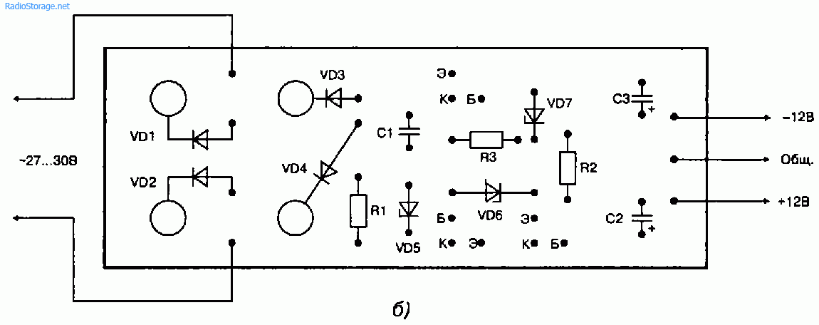 Рис. 3. Монтаж деталей на печатной плате для двухполярного источника питания.