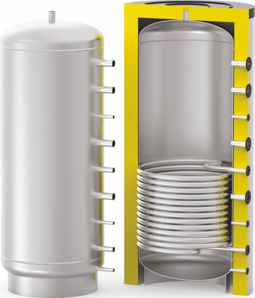 В качестве главной детали данного агрегата выступает цилиндрической формы нержавеющий бак, наполненный жидкостью, характеризующейся высоким коэффициентом теплоотдачи. Его обвязка осуществляется теплоизолирующим материалом. В сочетании с установкой верхней рубашки, такое конструктивное решение увеличивает время остывания теплоаккумулятора. Внутри цилиндрической ёмкости размещаются от 1 до 3 теплообменников. Количество змеевиков определяется возможностями и потребностями хозяев жилья.