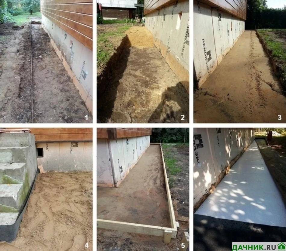 - Подготовить основание. Вырыть траншею шириной до 1,5 м. Глубина раскопа до 0,3 м. Уклон в сторону от цоколя.