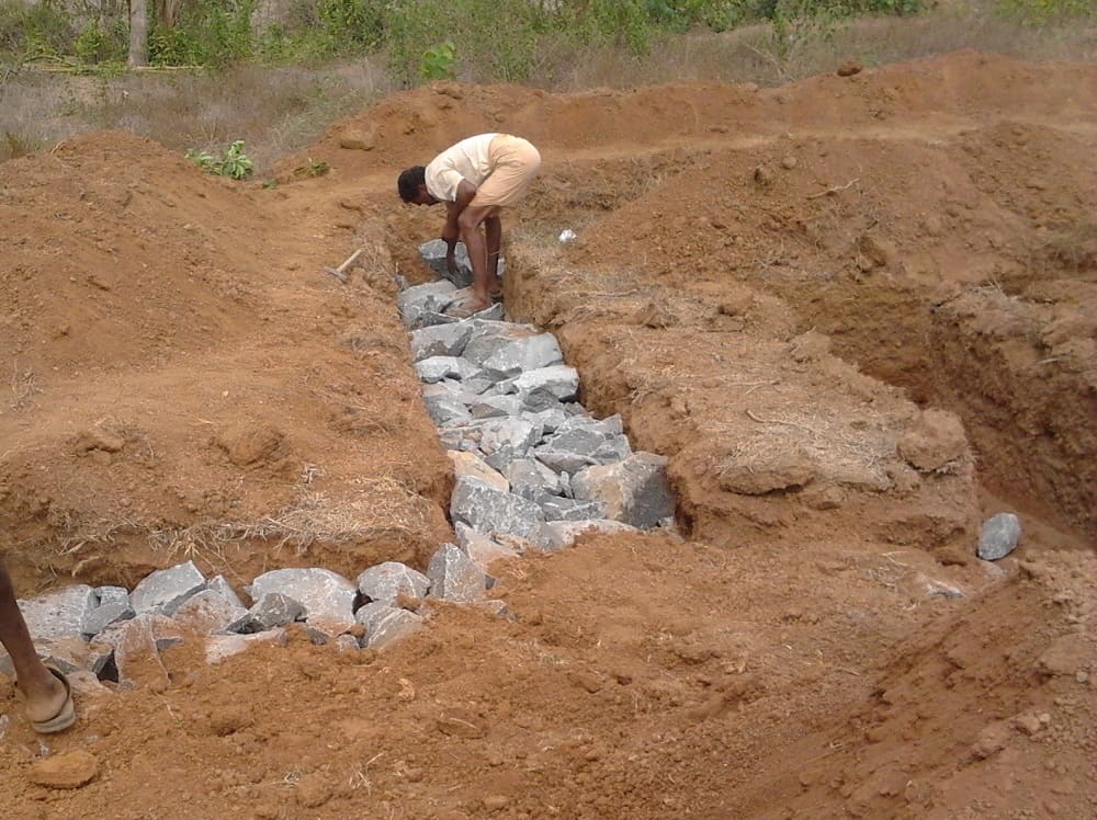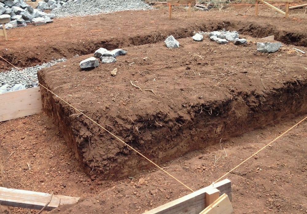 Чтобы соорудить своими руками фундамент из бутового камня, участок под закладку основания тщательным образом зачищают. Далее выполняется исследование почвы на глубину залегания подземных вод и подготовка подушки. Площадка под фундамент из бута освобождается от мягкого почвенного слоя и размечается. По этой разметке выкапывается траншея, куда кладётся песчано-щебневая подушка и дренаж.