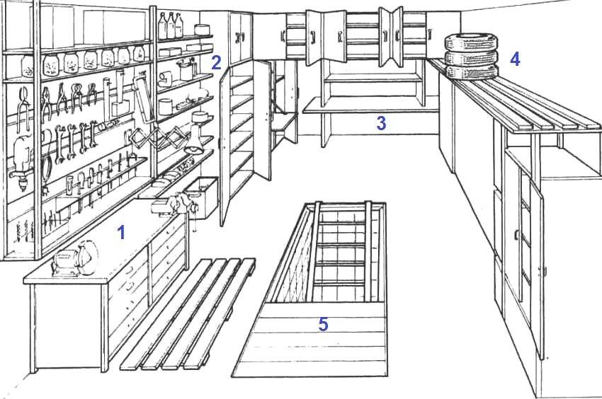 Если вы посмотрите на фото, которое демонстрирует оптимальный набор полезных мебельных элементов, то отметите для себя полезные нюансы. Во-первых, расположение любой системы хранения должно быть расположено на определенном расстоянии от стен. Считается, что между стоящей внутри помещения машиной и стеллажом должно быть как минимум полметра для нормальной, комфортной работы внутри. Если же по форме хранилище вашей машины скорее прямоугольник, а не квадрат (так бывает достаточно часто), то стоит переместить все хранилище для инструментов и полезный вещей в одну зону вдоль дальней стенки, противоположной двери. Именно здесь вы сможете с максимальным удобством поставить не только стол или стеллаж, но и даже столярный или токарный станок. Нелишним будет упомянуть, что располагать внутри гаража все хранилище ваших инструментов следует только в том случае, если он надежно закрыт или находится под защитой крепко закрытых ворот на даче. В противном же случае, лучше размещать там только самое необходимое, желательно, не представляющее особенной ценности для грабителей.