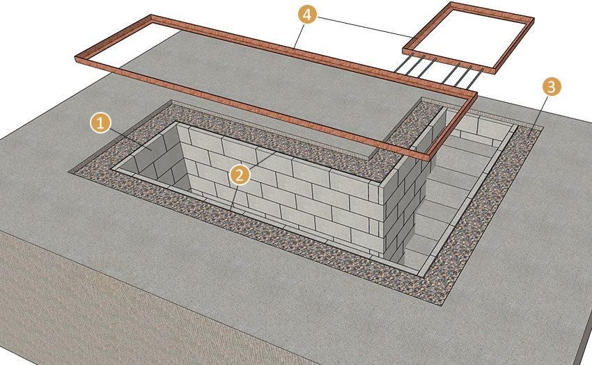 Схема обустройства смотровой ямы: 1 — стенки из пеноблоков, 2 — гидроизоляция, 3 — бутовая кладка. 4 — уголок размером 50х50х4 мм