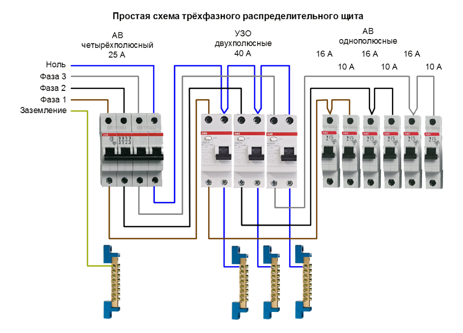 Подключение к 3-х фазной электросети обуславливает установку трехфазных электрощитов. Ниже разберем пять разных вариантов простых трехфазных схем для распределительного щита.