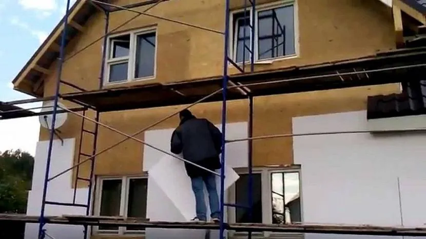 На фото процесс утепления каркасного дома снаружи Источник uteplitel.org