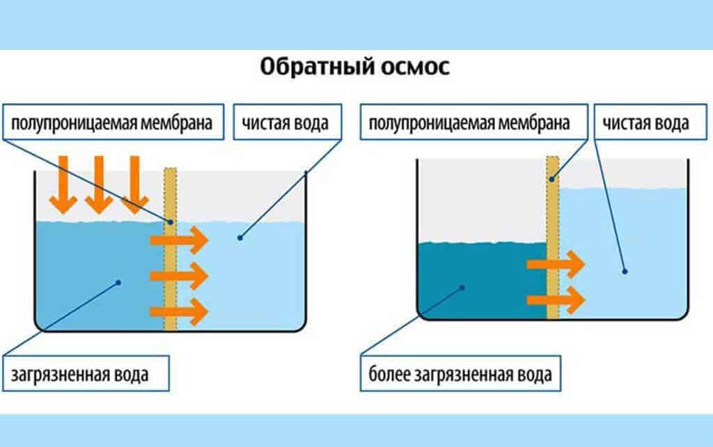 Особенность работы такихсистем заключается в том, что мембрана, расположенная в основе, по принципу обратного осмоса пропускает частицы воды и кислорода, но задерживает различные примеси.