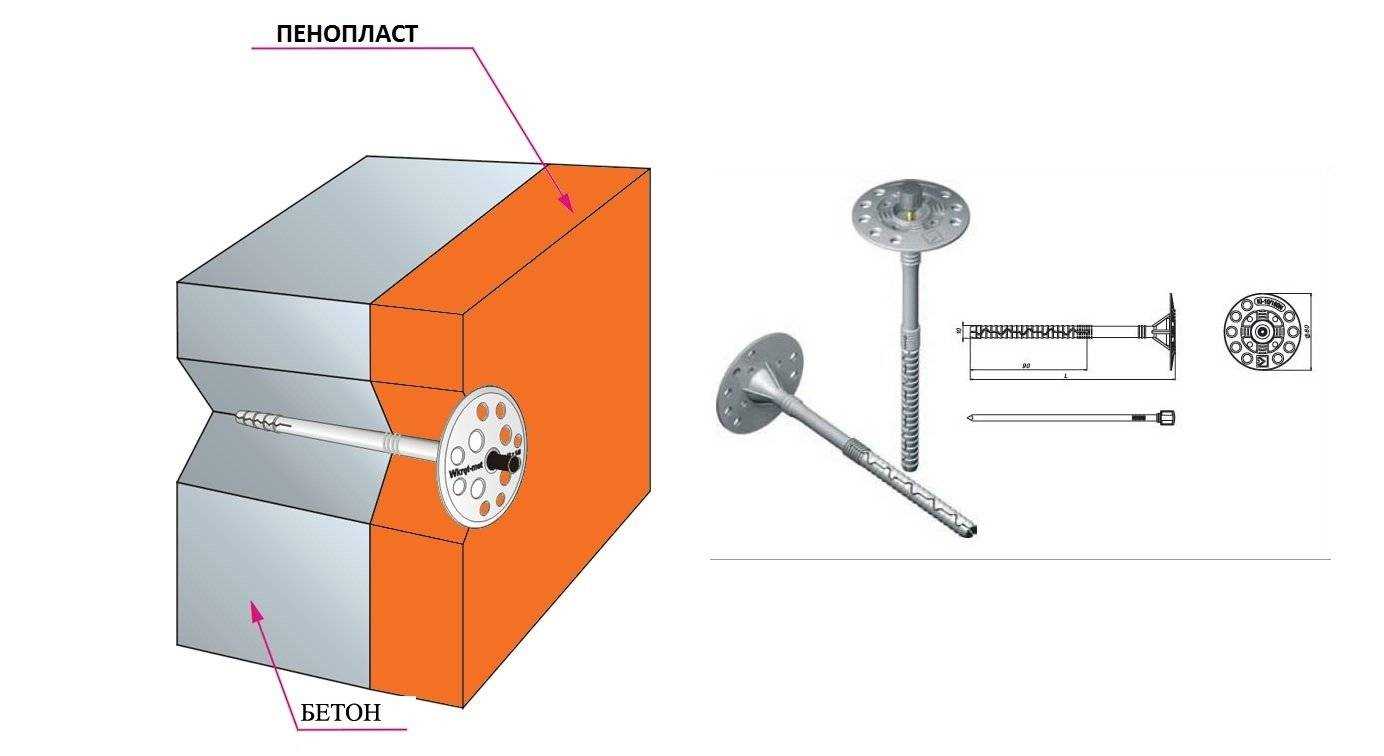 Для работы могут использоваться пластиковые или металлические грибки для крепления, способные выдерживать тяжелые отделочные материалы и устойчивые к повреждениям.