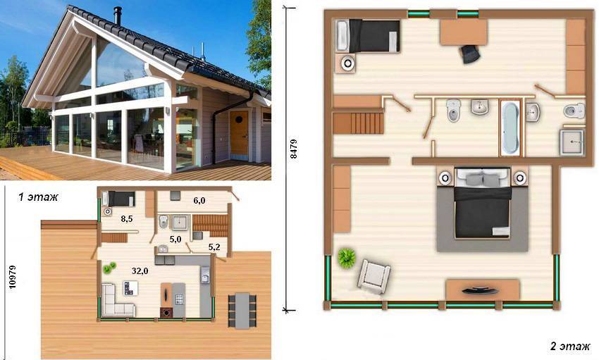 - ограничиться минимумом помещений, зато они будут просторными. Как пример можно привести планировку комнат в доме 6 на 6 м – на 1 этаже разместилась гостиная (или зал-студия), совмещенная с кухней, а на втором – просторная спальня с балконом. Конечно, набор минимальный, зато комнаты просторные.