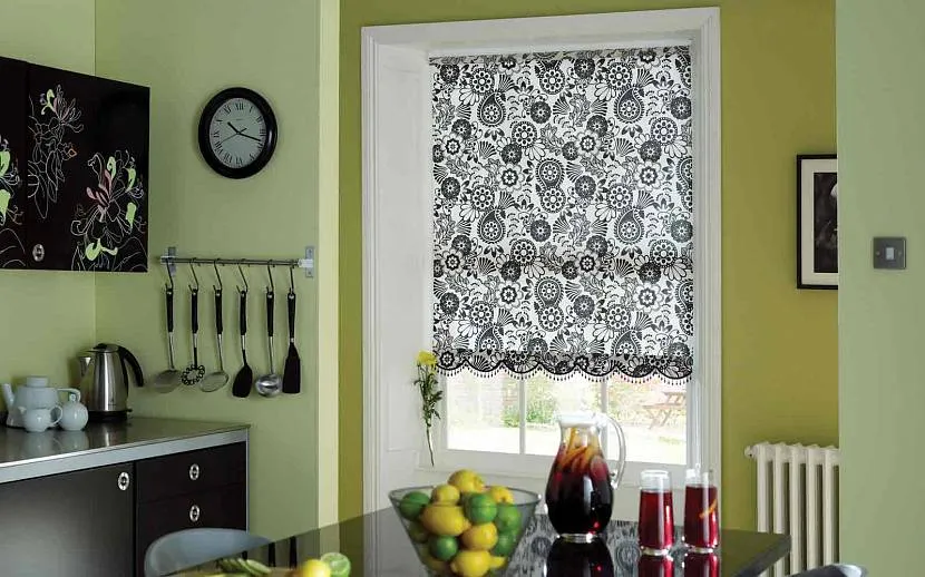 Черные шторы на кухне тоже актуальны. Выбирайте короткие модели: римские, рулонные либо жалюзи.
