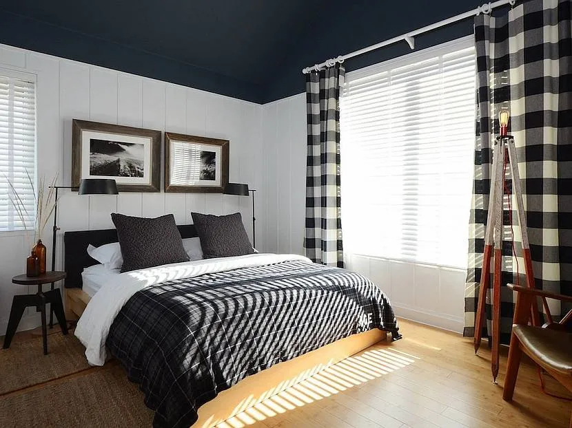 Кантри, контемпорари (современный). В стилистику этих стилей впишутся шторы из ткани с черно-белым узором а-ля «шотландка».