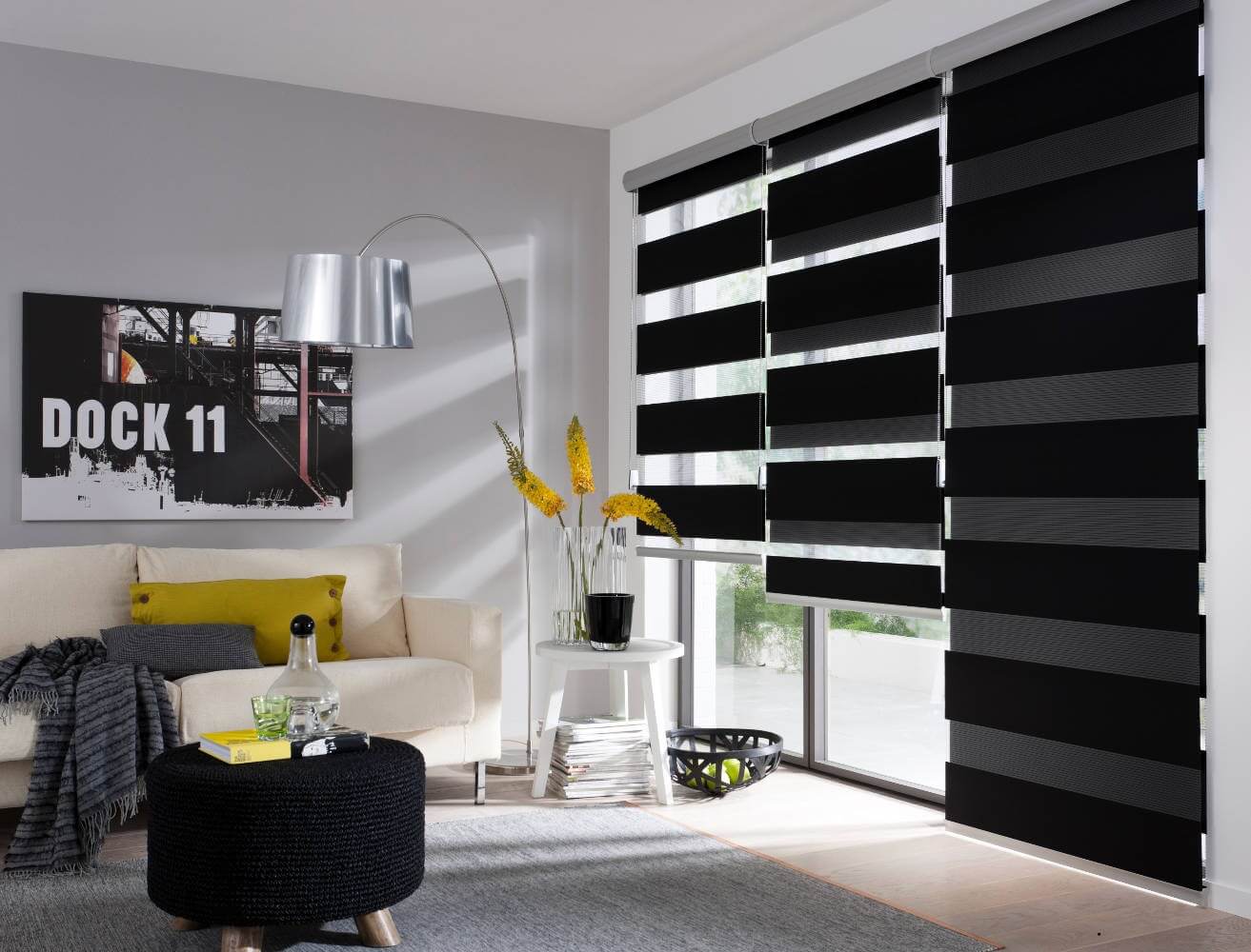 С черными шторами этого типа необходимо соблюдать меру и осторожность, обязательно разбавить дополнительные элементы белым или светлым цветом
