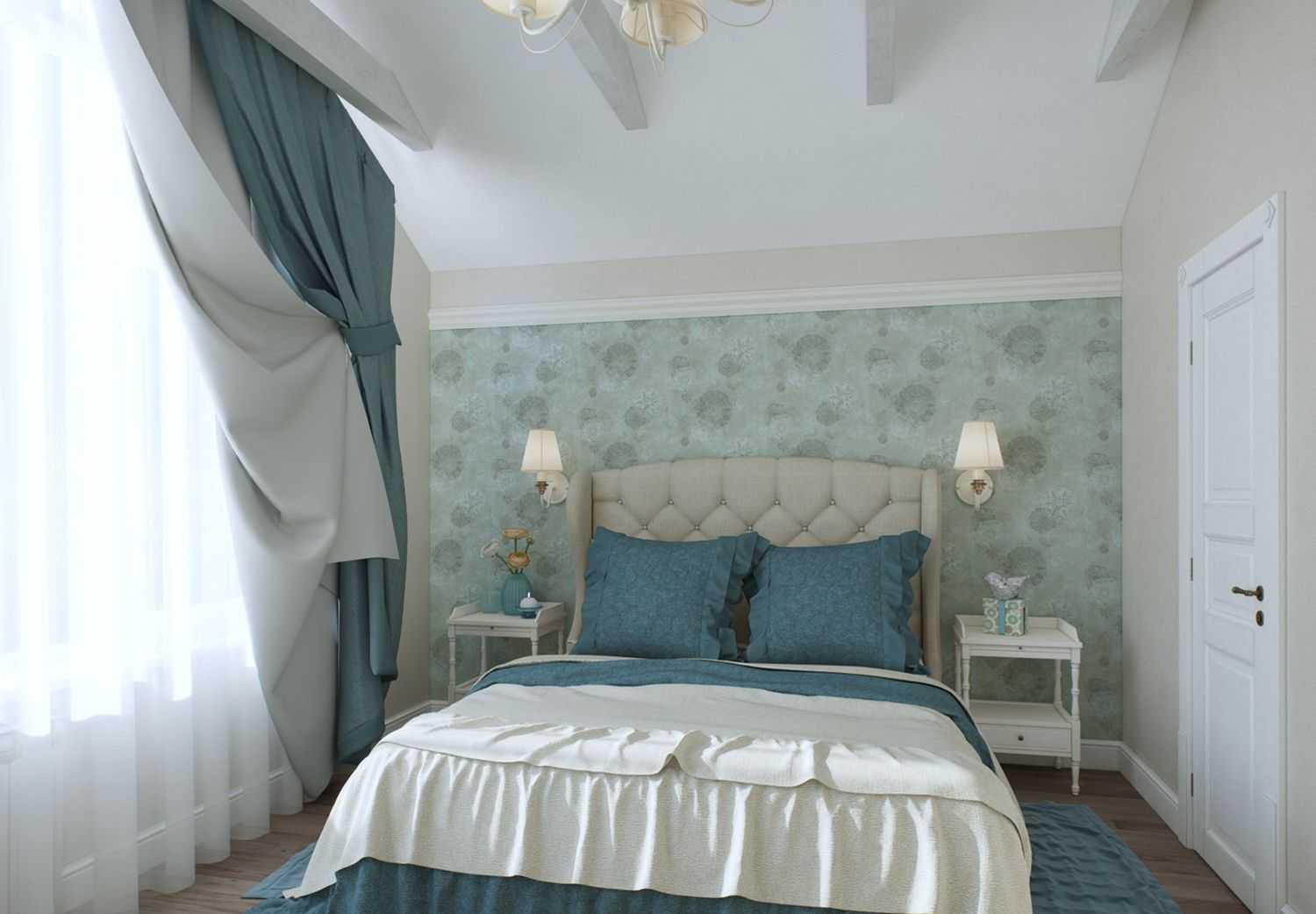 На фото представлен один из удачных вариантов интерьерного решения: покрывало на постели в тон штор – показатель хорошего вкуса. Такой вариант сочетания деталей можно встретить почти во всех стилях. Выгодно подчёркивают убранство комнаты аккуратная люстра, чёрные глянцевые светильники и рамки картин.
