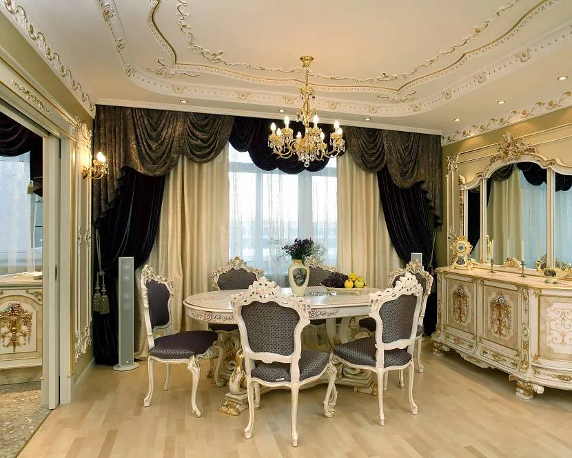 Роскошные, классические барочные интерьеры, модерн. Черные гардины в окружении бело-золотой отделки, зеркал, дорогих люстр и изящной мебели создают респектабельную обстановку.
