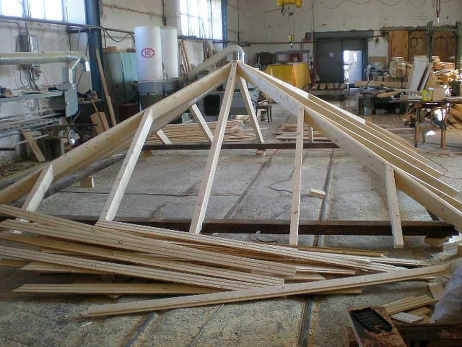 Изготовляется из двух скатов в виде треугольников и двух трапецеидального вида, стропила выполняются без переломов, начало берут от конька, свесы выходят одинаковыми по высоте.
