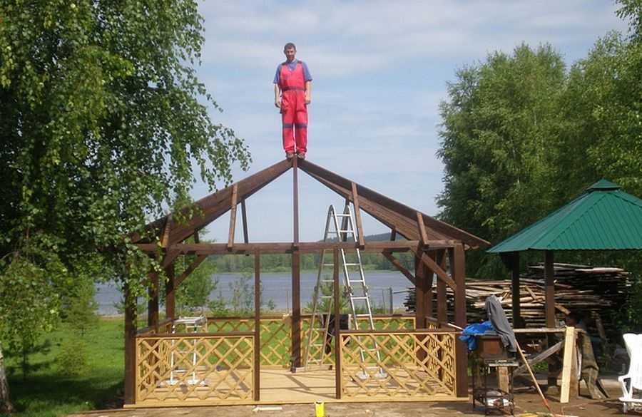 Собранную систему водружаем на стойки беседки, крепим гвоздями, уголками, закрепляем укосами. После этого можно монтировать обрешетку (в данном случае — сплошную) и настилать кровельный материал.
